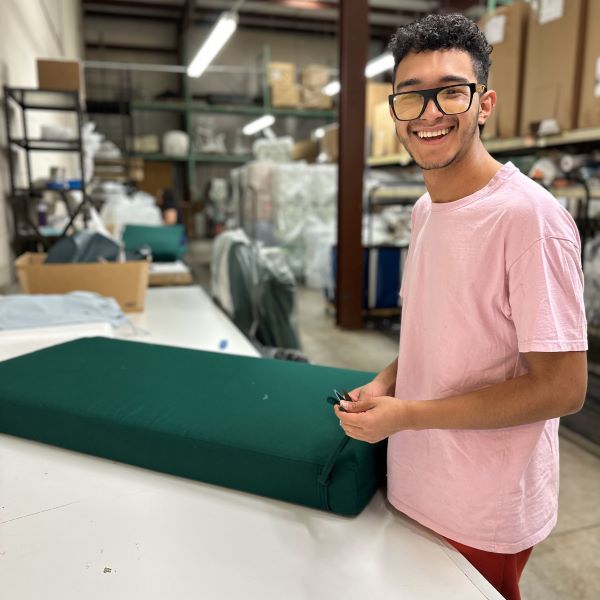 Your cushion will be stuffed with the highest quality foam and fiber batting, all encased in our exclusive water-resistant ticking (liner). Our pneumatic stuffing machines do the brunt of the work before each cushion is finished, zippered and inspected by hand.